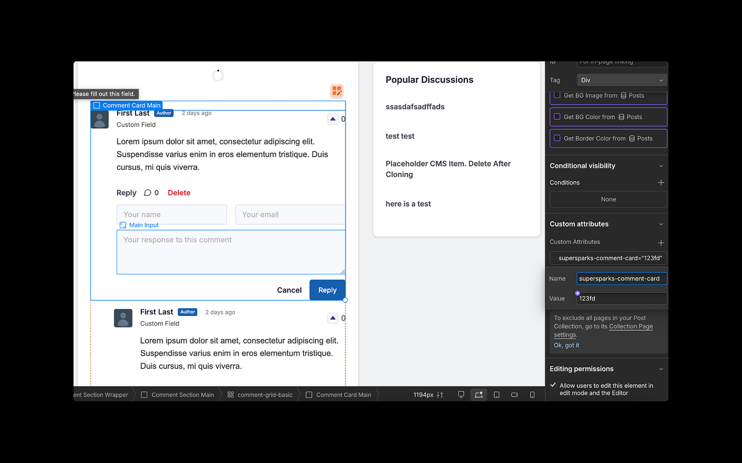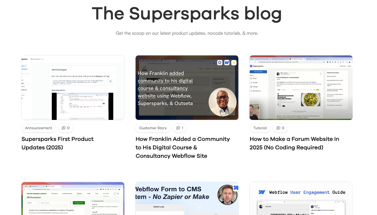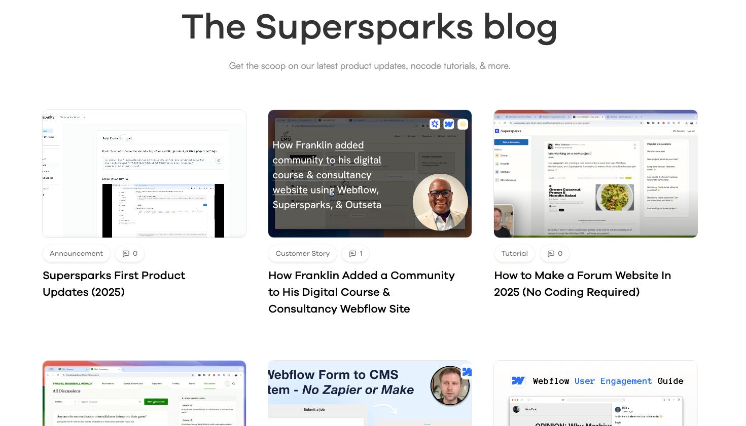 Unlike generic embedded widgets that don't match your site's design, Supersparks lets you design everything right in the Webflow Designer so it looks and feels like a natural part of your site. Through these features, our tool unlocks the following use cases for Webflow sites: forums, blog commenting, social media platforms, job boards, directory & product reviews, and much more Supersparks seamlessly integrates with Memberstack and Outseta, which arecommonly used membership tools with Webflow sites, so when a user is logged in through either tool and posts content through ours, profile details (eg. name, avatar, etc) gets automatically displayed with their content.