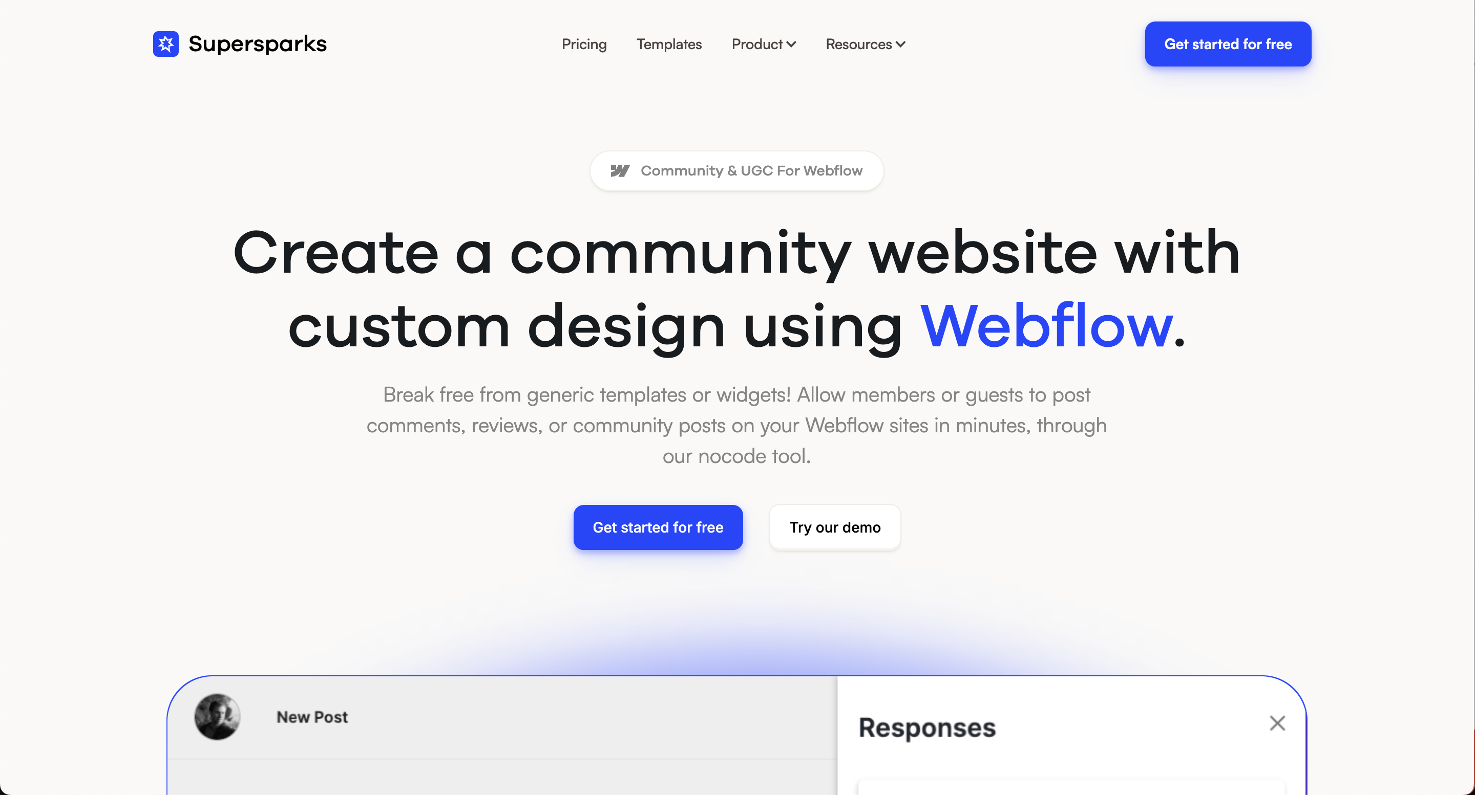 Supersparks solves a major pain point for Webflow users by allowing them to add user-generated content like comments, reviews & ratings, upvoting, and community posting directly on their Webflow sites without compromising on design control.