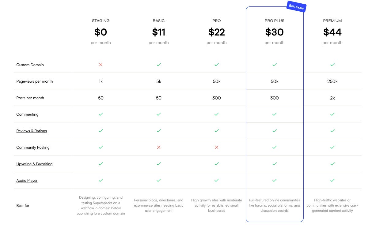 We've designed it to give users as much time as they need to test and implement our tool before committing to a paid plan. Supersparks is free to use on staging domains for Webflow, allowing users to design and test everything before going live.