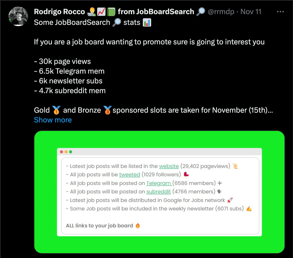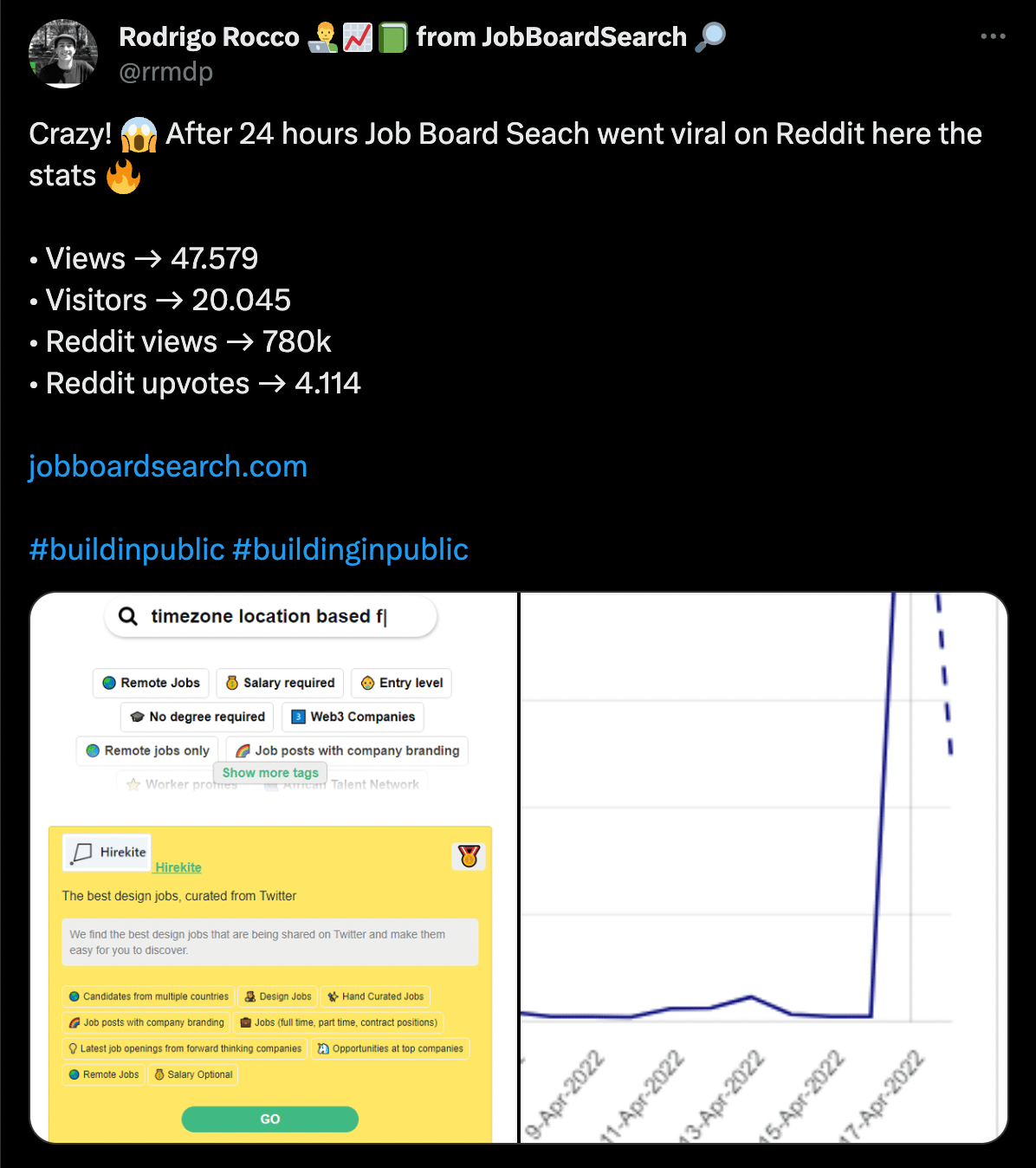 Building in public on Twitter, a real win-win situation for me and JobBoardSearch. It is where most job board founders learn that it exists.
