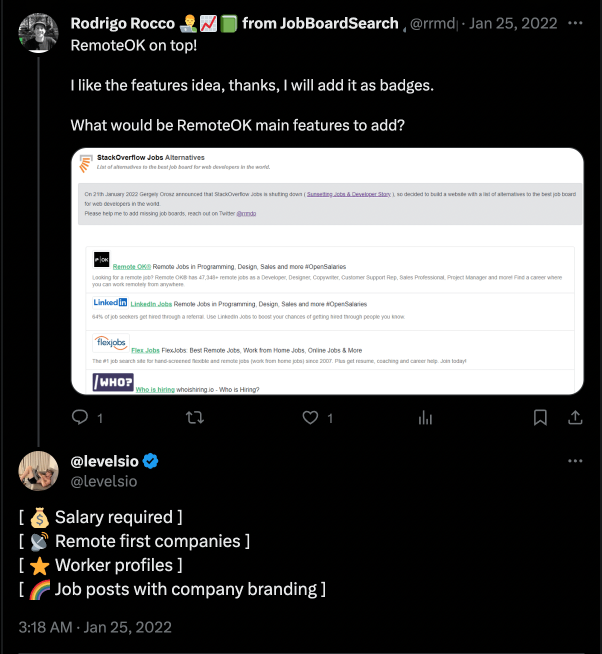 The next day he sent me a DM saying he would help me a bit to promote if I put RemoteOK on 1st place, it was a blast for me đ A lot of job board founders started DMing me or replying to get included in the list, there was a lot of interest.