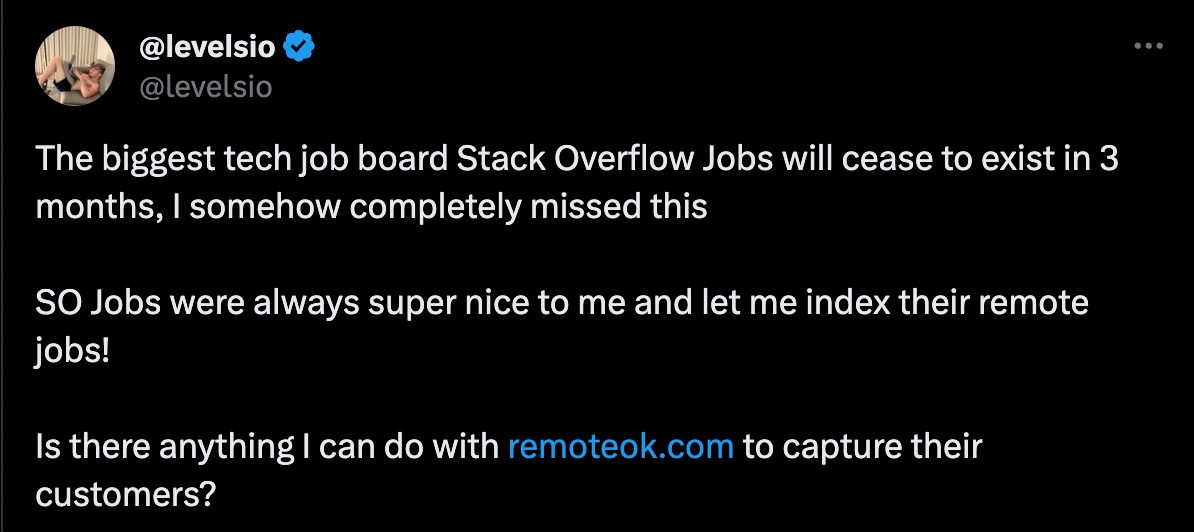 He tweeted about Stack Overflow Jobs shutting down, under the tweet a lot of folks where asking about alternatives and I thought âI can build a list just for funâ.