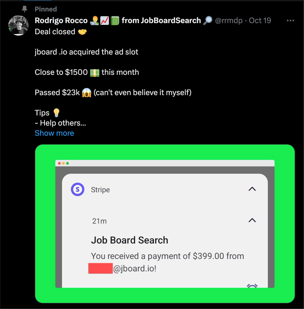 I tweeted about the paid options and almost immediately, Phil from 4 day week job board acquired a sponsored slot and became the 1st premium job board ever (and he is still sponsoring the site). Minutes later another founder paid and the next morning the 3rd payment came. I couldnât believe it and realized that I was onto something.